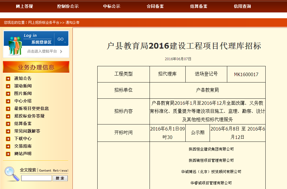 2016年6月1日9时30分,户县教育局组织的户县教育局2016建设工程代理库招标在西安市建设工程交易中心召开。本次投标在公司领导的精心组织下,在招标代理部门全力以赴,市场开发部积极配合下,华睿诚以第四名的优异成绩成功入围。长期以来,我们一直为教育系统提供着优质专业的服务。此次成功入围,我们将继续秉承“服务第一,客户至上”的服务理念,继续为户县的教育事业建设提供优质服务!